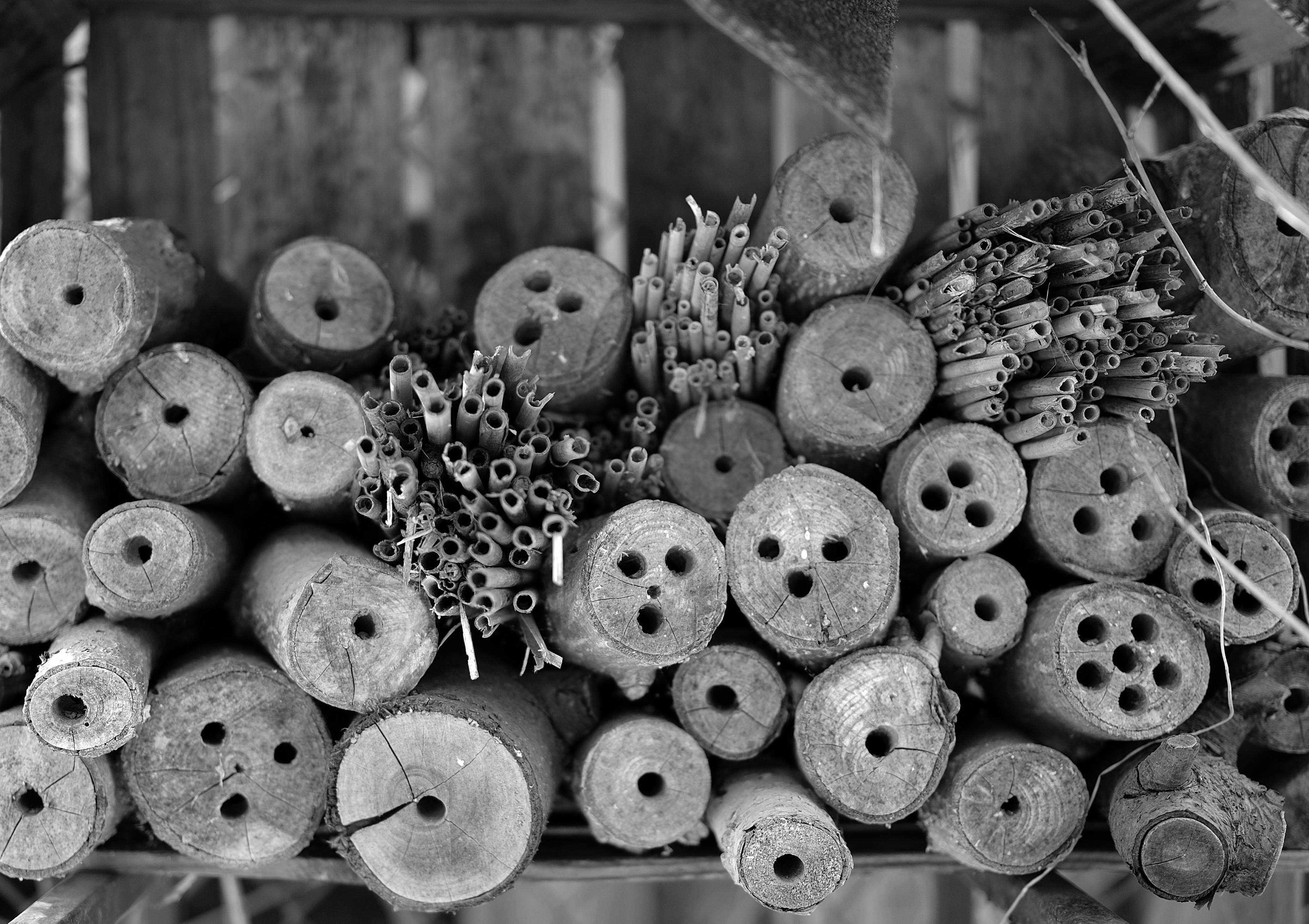 Gli “hotel per insetti” che si vedono in tanti giardini urbani non sono solo decorativi: i piccoli tubi e fori di legno diventano vere e proprie culle dove le api solitarie depongono le uova insieme a una scorta di polline per le future larve.